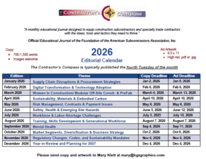 The Contractor’s Compass is the monthly educational journal of the Foundation of the American Subcontractors Association, Inc. (FASA). The journal is designed to equip construction subcontractors and specialty trade contractors with the ideas, tools and tactics they need to thrive.